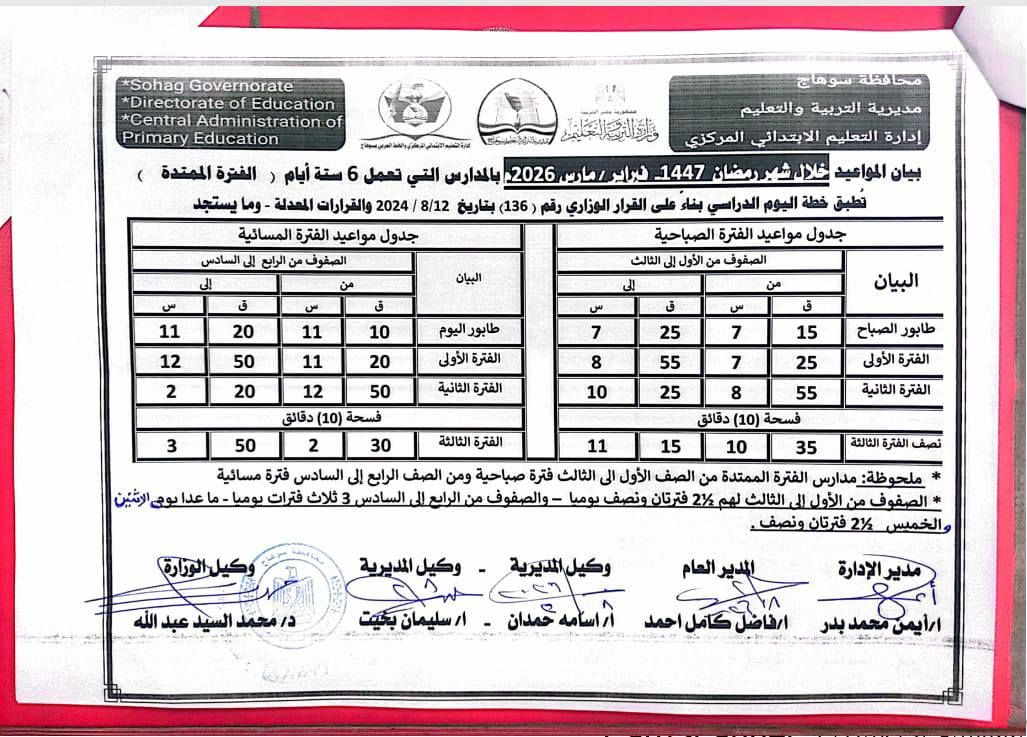 توقيعات واعتماد رسميوجاء اعتماد البيان بتوقيع عدد من القيادات التعليمية، بينهم مدير الإدارة، والمدير العام، ووكلاء المديرية، وذلك في إطار الحرص على انتظام العملية التعليمية وتخفيف الأعباء على الطلاب والمعلمين خلال شهر رمضان المبارك.