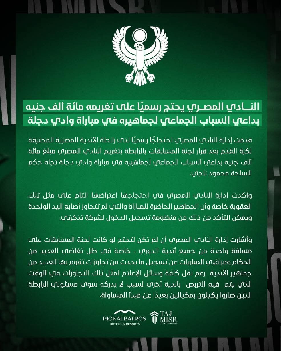 بيان المصريوأكدت إدارة النادي المصري في احتجاجها اعتراضها التام على مثل تلك العقوبة خاصة وأن الجماهير الحاضرة للمباراة والتي لم تتجاوز أصابع اليد الواحدة، ويمكن التأكد من ذلك من منظومة تسجيل الدخول لشركة تذكرتي.