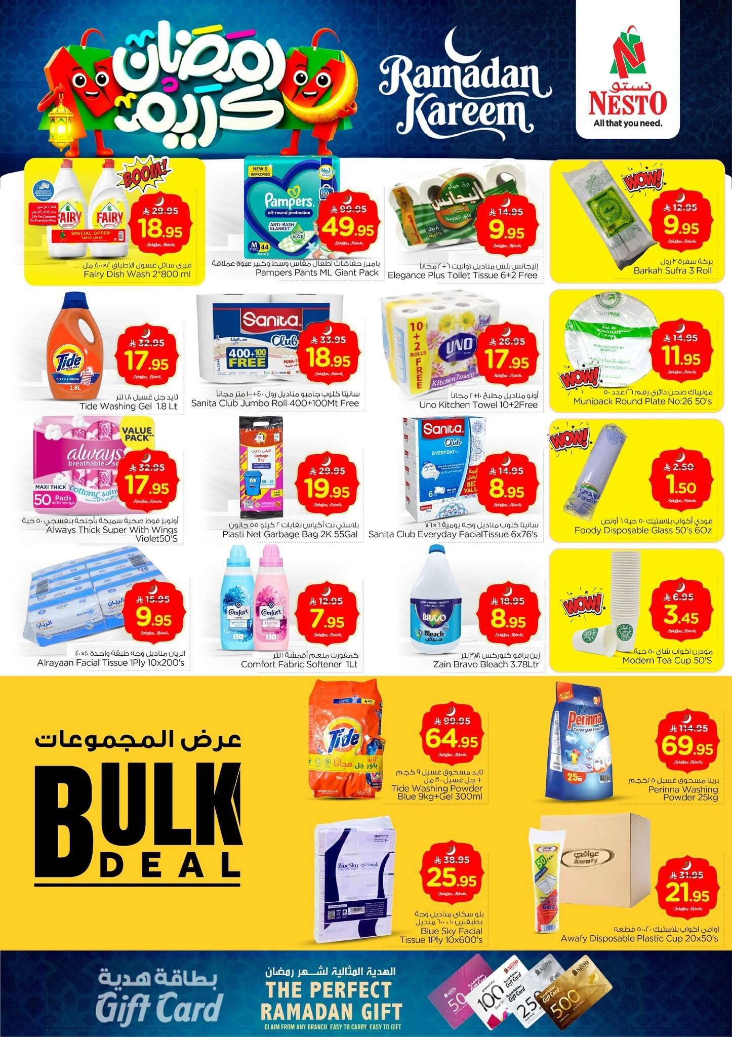و تحتوي ايضا نستو الاحساء هذا الاسبوع علي الحليب والمعلبات والحلويات الجاهزة والمشروبات الرمضانية كما تضمنت تخفيضات واسعة على المنظفات المنزلية ومساحيق الغسيل ومنتجات العناية بالشخصية