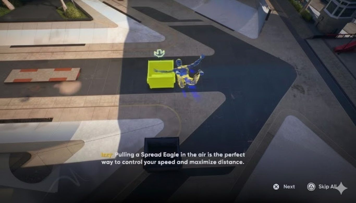 بعد إنشاء شخصيتك في Skate، ستبدأ بجولة تعريفية تعلمك كل الحركات الأساسية والميكانيكيات الضرورية لأداء الحيل وكسب النقاط وSan Van Bucks. يشمل ذلك Grinds، حيل القفز واللف (Flip Tricks)، تحديات الأكروبات، وغيرها من الحركات الهوائية.
