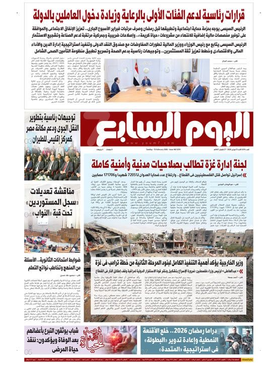 ينشر "اليوم السابع" فى عدده الصادر غدا، تفاصيل هامة حول العديد من الأحداث الجارية على الساحتين الداخلية والخارجية أبرزها: قرارات رئاسية لدعم الفئات الأولى بالرعاية وزيادة دخول العاملين بالدولة.. لجنة إدارة غزة تطالب بصلاحيات مدنية وأمنية كاملة.. دراما رمضان 2026 خلع الأقنعة النمطية وإعادة تدوير البطولة فى استراتيجية المتحدة