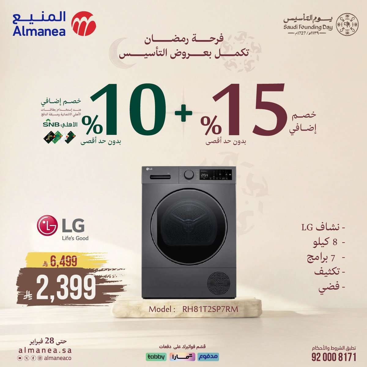 عروض المنيع مستمرة حتي السبت 28-2-2026 الموافق 11 رمضان 1447 و تحتوي علي تشكيلة واسعة من الأجهزة المنزلية بمناسبة يوم التأسيس وقرب رمضان تضم ثلاجات ونشافات ملابس وشاشات ذكية كبيرة