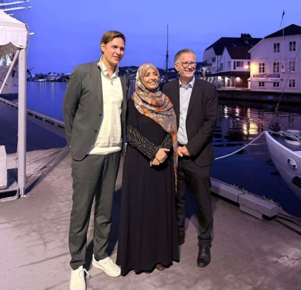 نشرت الناشطة اليمنية والحائزة على جائزة نوبل للسلام توكل كرمان، صورة تجمعها بـ رئيس وأمين عام لجنة جائزة نوبل للسلام، في منشور عبر حساباتها على مواقع التواصل الاجتماعي، عبّرت فيه عن ثقتها بأن الجائزة هذا العام ستُمنح لمناضل حقيقي في سبيل الحرية.