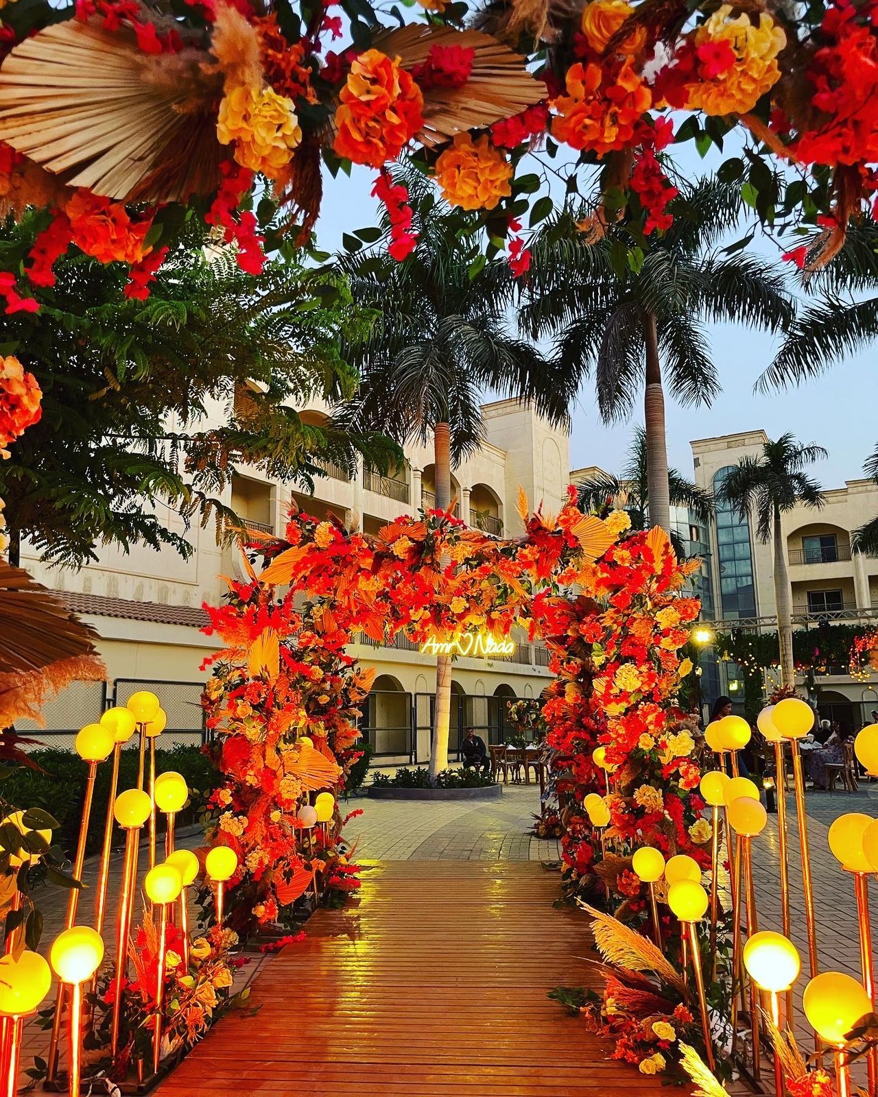 اللون البرتقالي جميل في إطار ديكور حفل الزفاف الخريفي (الصورة من أعمال روز عبدالفادي، خبيرة ومصممة ديكورات حفلات الزفاف) - البرتقالي: استوحي ألوان حفل زفافكِ في أكتوبر من أوراق الشجر النابضة بالحياة، باستخدام درجات الأصفر والبرتقالي المحروق. هذه الألوان الخريفية الزاهية، التي تجمع بين الجرأة والعصرية، ستجعل الدكور احتفالاً بكلّ ما يقدمه الخريف.