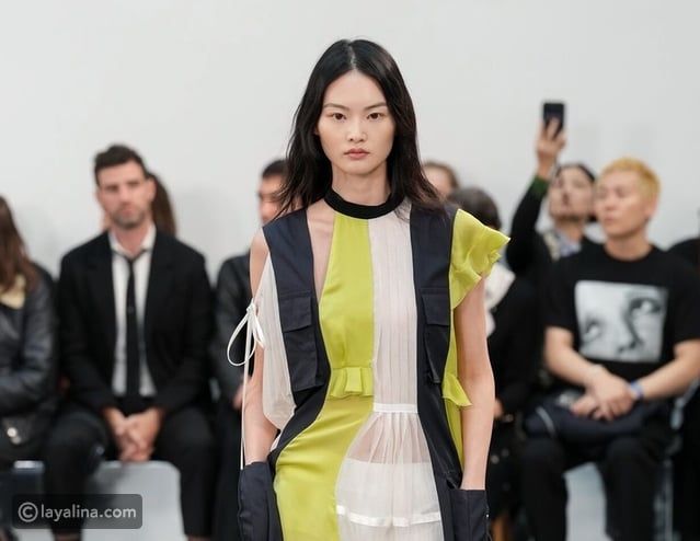 1. بينما ارتبطت تصاميم ساكاي دائمًا بالبنية القوية والقصّات المعمارية، فقد حمل هذا الموسم ملمسًا أكثر رقة وإنسانية، أدخلت آبي الشيفون والحرير على الأقمشة الصناعية المعروفة كالنايلون والدنيم، لتخلق توازنًا دقيقًا بين الصلابة التقنية والنعومة الأنثوية.