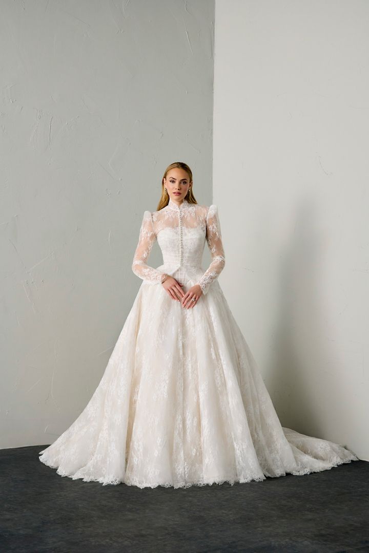 أعادت مجموعة جاستن ألكسندر Justin Alexander إلى الأذهان أناقة العصر الفيكتوري مع لمسة عصرية ستحبها عروس خريف 2026، فتألقت العارضات بفساتين تنحت الجسم عبر الكورسيه الذي ظهر في شكله الأصلي وأربطته المشدودة على الظهر في الكثير من الإطلالات، وعلى الرغم من هيمنة القصات الجريئة على المجموعة، إلا أننا وقفنا للحظة لنتأمل جمال الفستان المنفوش المغطى بالكامل بالدانتيل والمميز بأكمامه الطويلة ذات الأكتاف البارزة وياقته العالية التي ذكرتنا بإطلالات الأميرات.
