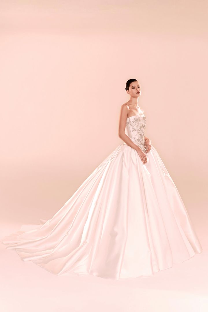 يواصل رامي العلي Rami Al Ali رسم نسخته الخاصة من الرومانسية العصرية في مجموعتة الجديدة White 8 من فساتين الأعراس، والتي جاءت كافتتاحية رائعة لعروض أسبوع نيويورك للعروس، ولم يتخل المبدع السوري عن خطوطه الهندسية التي أضحت هوية إبداعية لا تفارق مجموعاته، فتلاقت البنية الراكزة مع الخامات الانسيابية في تصميم واحد منتجة بعداً جمالياً رفع سقف طموحات عروس 2026، وكالعادة لم تغب الفساتين مستقيمة القصة عن مجموعته ولكنها رسمت بخطوط أكثر نعومة عن مواسم سابقة فاحتضنت منطقة الخصر بنعومة عبر الثنيات التي تجمعت أسفل الصدر، وأضفى الترتر اللامع لمسة فخامة على الصدر والتنورة الخلفية التي طبعت التصميم بلمسة ملوكية خاصة بتنسيقه مع قفازات الأوبرا الطويلة.