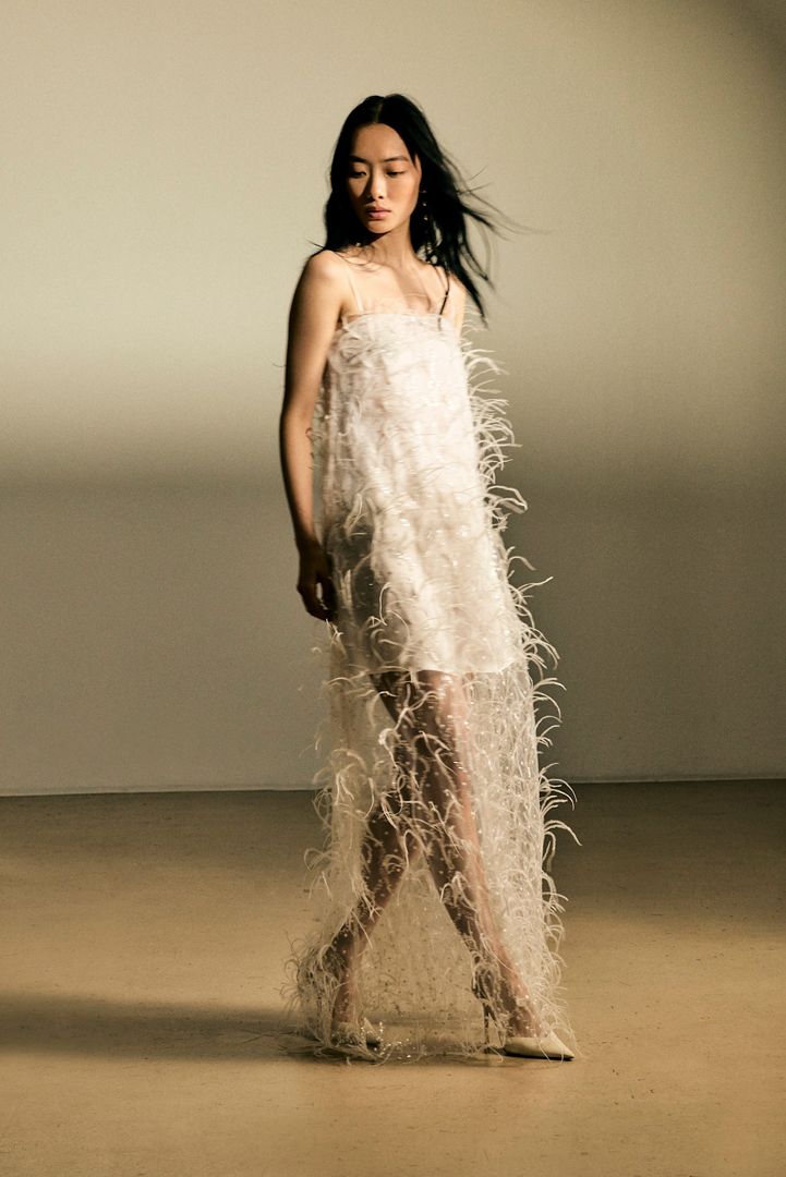 جاءت هذه المجموعة في اليوم الافتتاحي لأسبوع الموضة للعروس لتثبت أن التألق لا يعني التقيد ضاربة بخطوط فستان الزفاف التقليدي عرض الحائط، فهي باقة مهداة لعروس عملية تبحث عن موديل ترقص به حتى الصباح، لذا سيكون الفستان القصير المغلف بطبقة شيفون مزدانة بالريش النافر خيارها الأول.