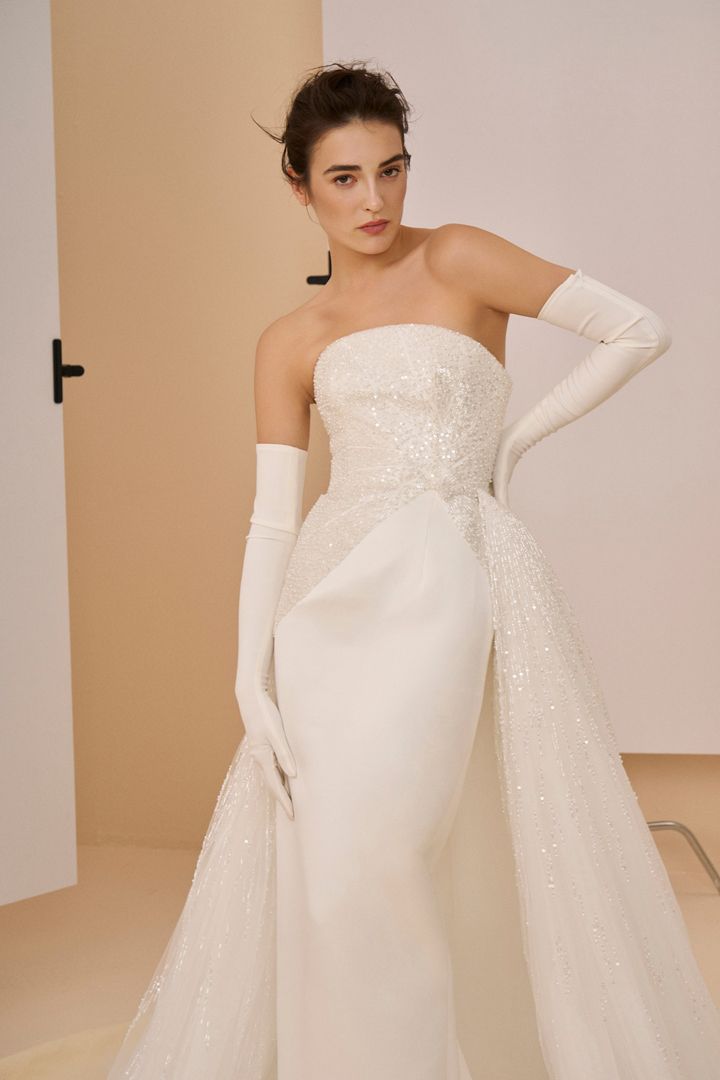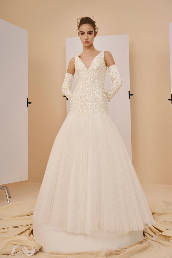 تخللت المجموعة باقة من الفساتين المتألقة بلمعان آسر بفضل التطريزات المنمقة والمتداخلة التي حبكت التوب، فمزجت بين الترتر اللامع واللؤلؤ المتدلي والذي غلف القفازات الطويلة أيضاً، وبدا لنا أن فساتين الزفاف منخفضة الخصر لن تخرج عن الموضة على الأقل هي مستمرة معنا إلى نهاية العام القادم.