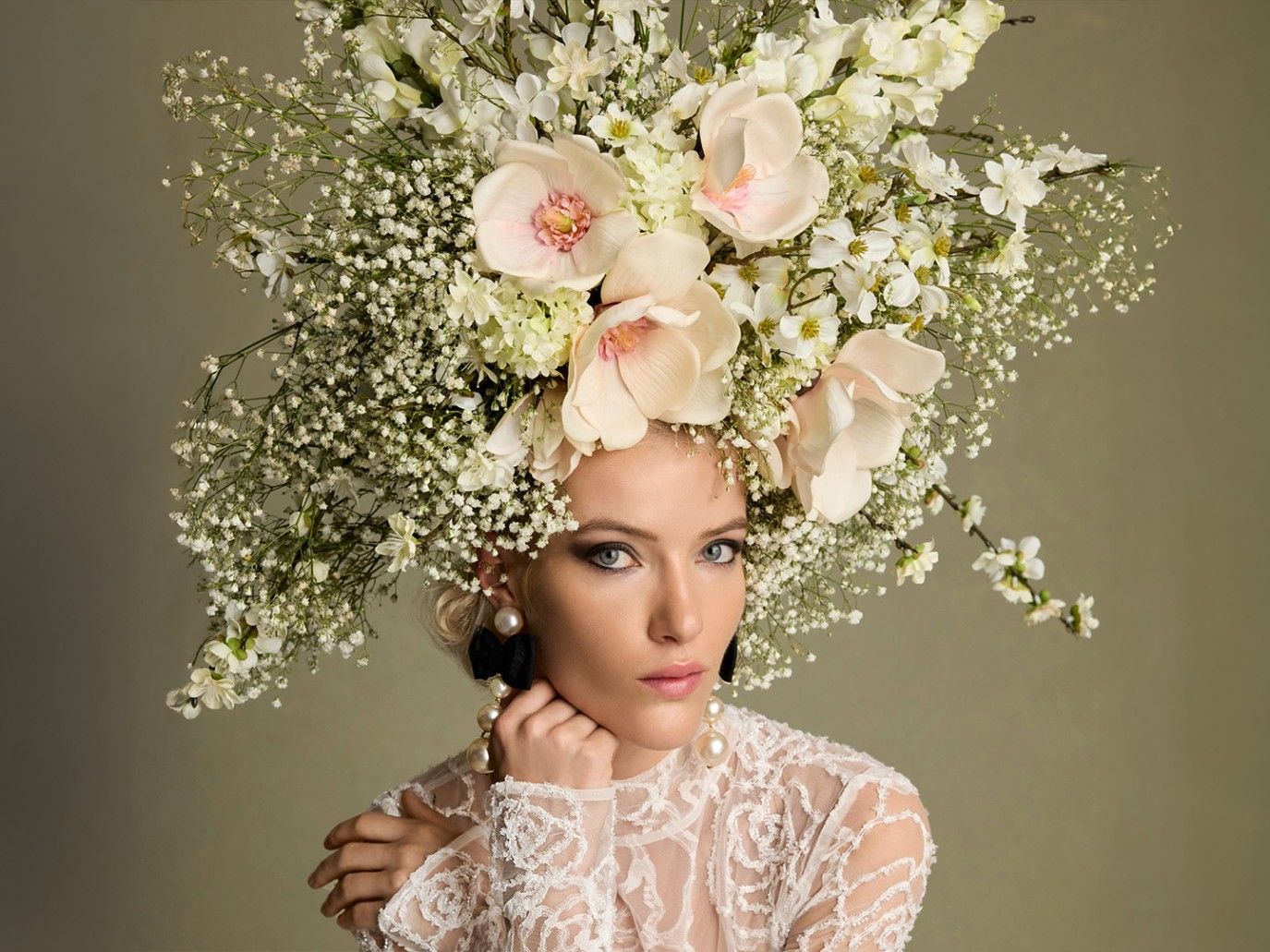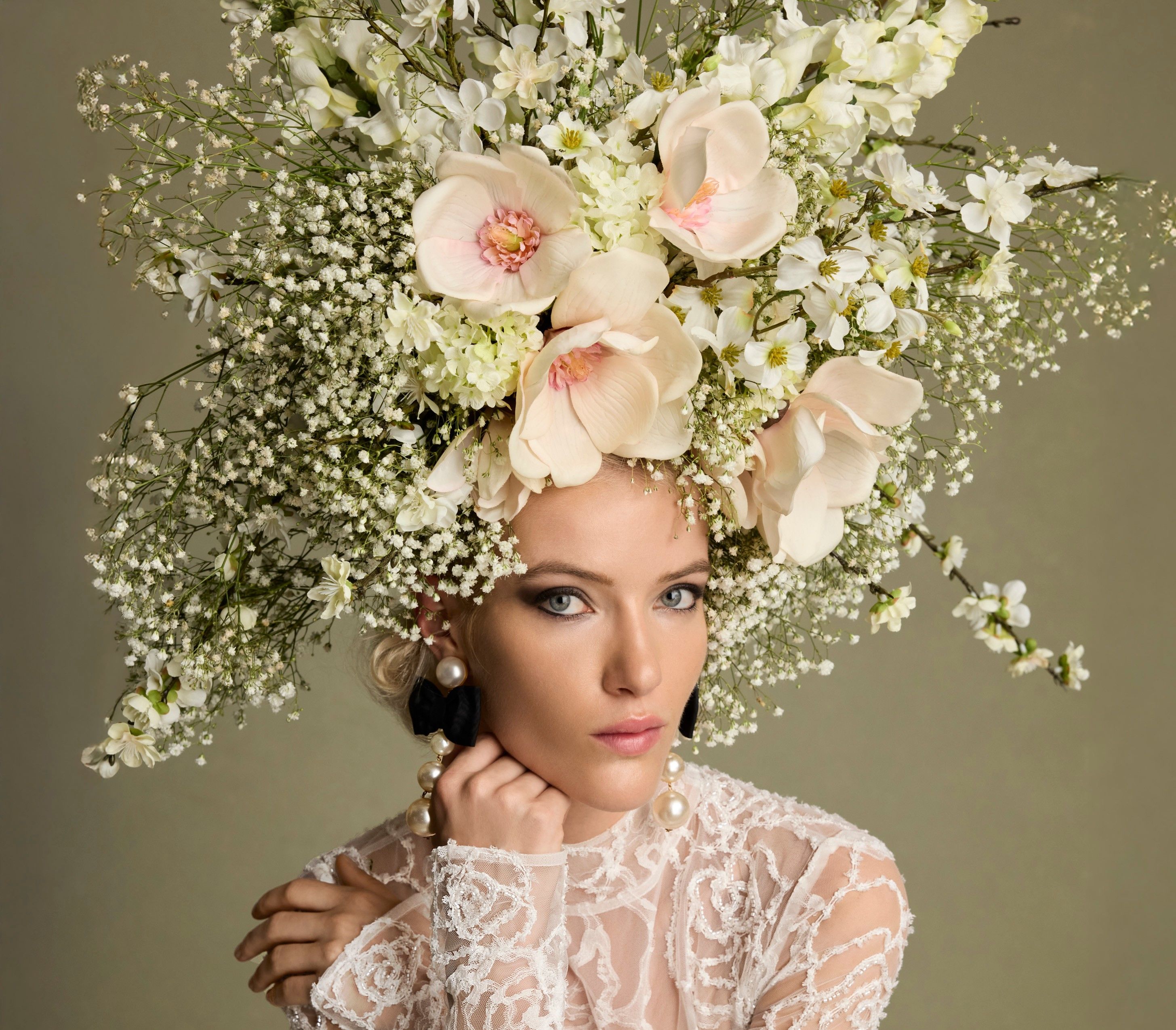 مكياج سموكي أسود ناعم مع الشعر المغطى بالورود بأسلوب ضخم