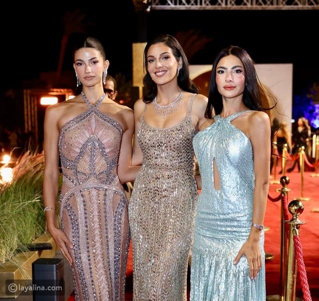 اختارت رزان جمال فستاناً ضيقاً بحمّالات رفيعة من إيلي صعب، تميّز بتطريزات هندسية دقيقة. أما تارا عماد، فقد اختارت فستاناً طويلاً بلون ذهبي محايد من توقيع المصمم نفسه، بقصّة ضيقة وياقة Halter Neck مزينة بالكريستالات اللامعة.