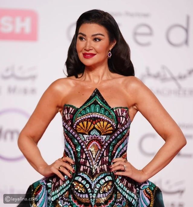 اختارت الفنانة لبلبة إطلالة أنيقة بتدرجات لونية متداخلة بين الأزرق، الأسود، والأحمر مع تطريزات لامعة براقة. المميز في إطلالتها أنها جاءت مستوحاة من الطابع الفرعوني عبر الرسومات التي حملها الفستان.
