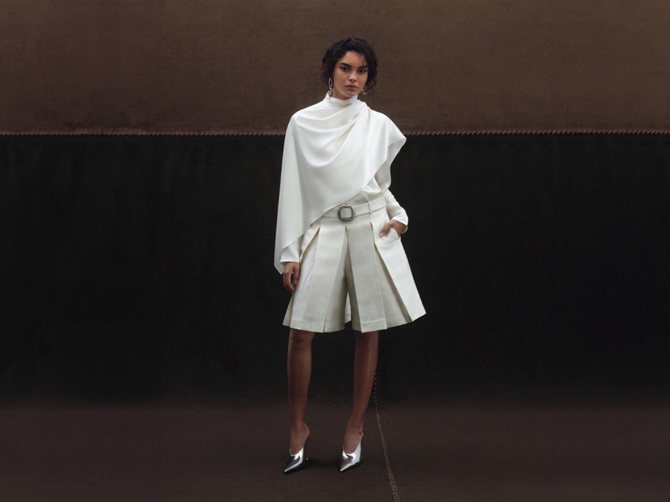 اكسري المألوف وتبني واحدة من الأفكار الجريئة التي قدمتها لنا مجموعات فساتين الأعراس لموسم خريف 2026، فلا تترددي في ارتداء الشورت الـ Tailored الأبيض الطويل في يوم زفافك خاصة إذا كنت تخططين لحفلة منزلية، قدمت لنا ماركة Lein مثالاً رائعاً لهذا الستايل حيث ظهرت العارضة بشورت واسعة يلامس الركبة بالكاد نسقته مع توب ووشاح كبير يلف الجزء العلوي من الجسم، تممي هذه الطلة بحذاء فضي على طريقتها، وزيني أذنيك بأقراط Hoops.