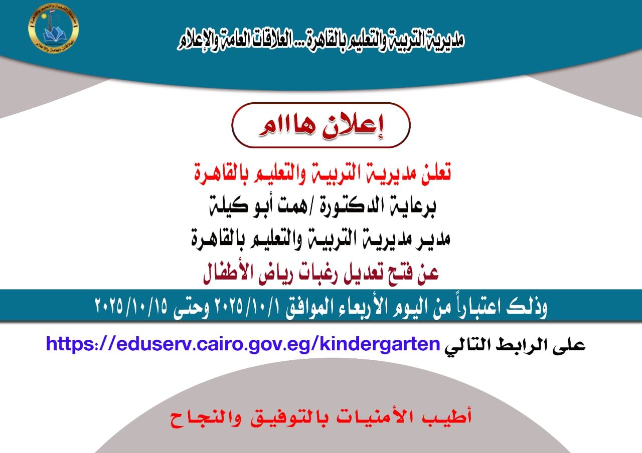 أعلنت الدكتورة همت أبو كيلة، مدير مديرية التربية والتعليم بالقاهرة، عن فتح تعديل رغبات رياض الأطفال، وذلك اعتباراً من اليوم الأربعاء، حتى الأربعاء الموافق 2025/10/15، على الرابط التالى هنا..