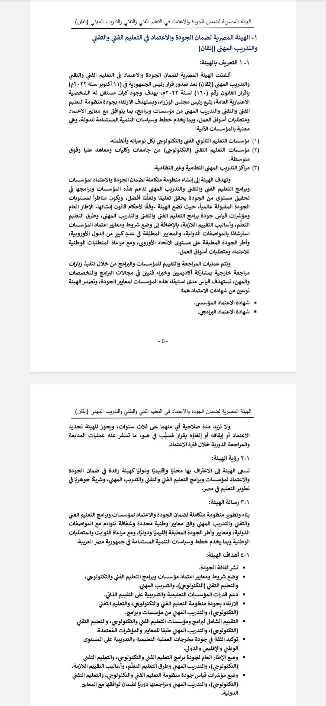 الأربعاء، 15 أكتوبر 2025 03:00 صأنشئت الهيئة المصرية لضمان الجودة والاعتماد فى التعليم الفنى والتقنى والتدريب المهنى (إتقان) الهيئة المصرية لضمان الجودة والاعتماد فى التعليم الفنى والتقنى والتدريب المهنى إتقان بعد صدور قرار رئيس الجمهورية فى 11 أكتوبر سنة 2022، بإقرار القانون رقم 160 لسنة 2022، بهدف وجود کیان مستقل له الشخصية الاعتبارية العامة، يتبع رئيس مجلس الوزراء، ويستهدف الارتقاء بجودة منظومة التعليم الفنى والتقنى والتدريب المهنى من مؤسسات وبرامج، بما يتوافق مع معايير الاعتماد ومتطلبات أسواق العمل، وبما يخدم خطط وسياسات التنمية المستدامة للدولة.