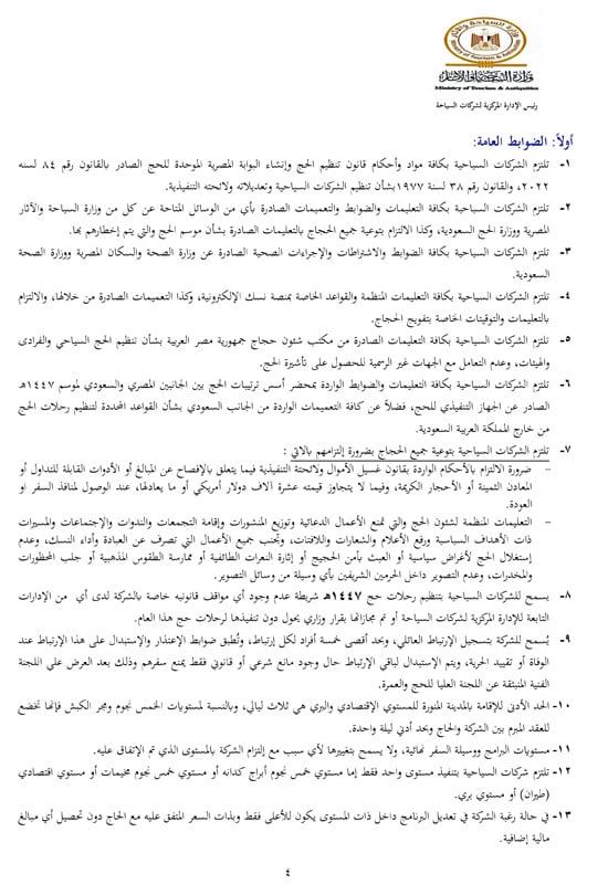 ينشر اليوم السابع ينشر اليوم السابع، النص الكامل للضوابط والقواعد المُنظمة للحج السياحي لعام 1447هـ، وفقاً لأحكام قانون 84 لسنة 2022 المنظم للحج، وقانون شركات السياحة رقم 38 لسنة 1977، وذلك في إطار الحرص على تحقيق التميز المستهدف والنهوض بمنظومة الحج السياحي وتطويره.