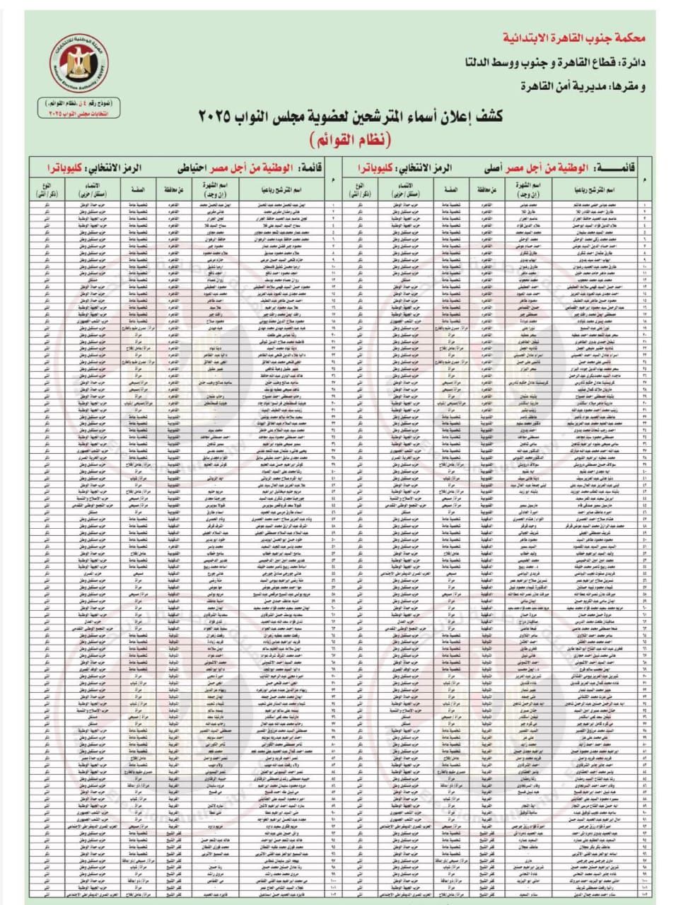 أسماء المرشحين على القائمة الوطنية من أجل مصر بقطاع القاهرة ورمزها كيلوبترا