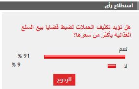 فى استطلاع للرأى طرحه "" على قرائه الأعزاء تحت عنوان هل تؤيد تكثيف الحملات لضبط قضايا بيع السلع الغذائية بأكثر من سعرها؟، أيد غالبية القراء مطالب تكثيف الحملات لضبط قضايا بيع السلع الغذائية بأكثر من سعرها.