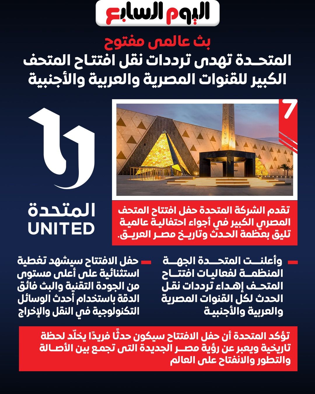 "الشركة المتحدة" الجهة المنظمة لفعاليات افتتاح المتحف المصري الكبير تعلن عن إهداء ترددات نقل الحدث لكل القنوات المصرية والعربية والأجنبية (إنفوجراف)