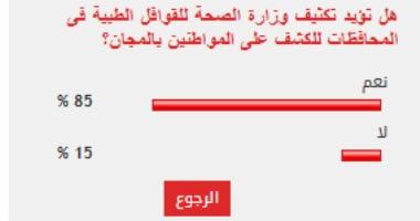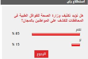 وأيد 85% من القراء مطالب تكثيف وزارة الصحة للقوافل الطبية فى المحافظات للكشف على المواطنين بالمجان، بينما رفض 15% مطالب تكثيف وزارة الصحة للقوافل الطبية فى المحافظات للكشف على المواطنين بالمجان.
