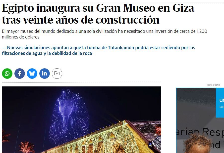 سلطت صحيفة الدياريو الإسبانية الضوء على افتتاح المتحف المصرى الكبير، قائلة إن الحفل أبهر العالم من الموسيقى للعروض الضوئية التى أبهرت الحضور على خلفية الأهرامات المهيبة بالجيزة ،مشيرة إلى أن المتحف المصرى الكبير يعد جسر الفراعنة ومستقبل السلام.