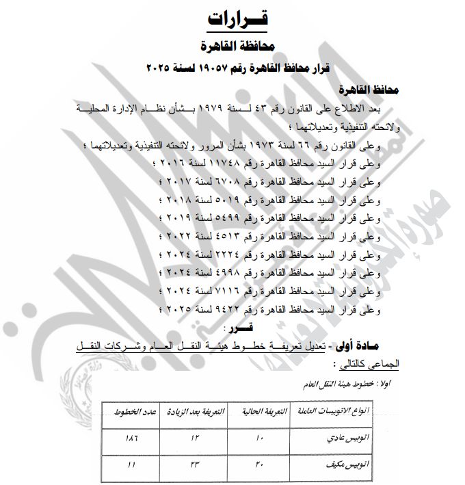 الجريدة الرسمية تنشر قرار محافظ القاهرة بتعديل تعريفة ركوب أتوبيسات النقل العام