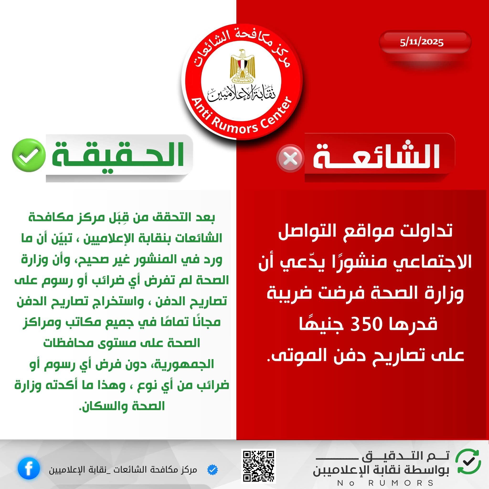 الأربعاء، 05 نوفمبر 2025 08:16 منفى مركز مكافحة الشائعات التابع لنقابة الإعلاميين برئاسة الدكتور طارق سعده، نقيب الإعلاميين، ما تداوله بعض حسابات على مواقع وسائل التواصل الاجتماعي من منشور يدّعي أن وزارة الصحة فرضت ضريبة قدرها 350 جنيهًا على تصاريح دفن الموتى.