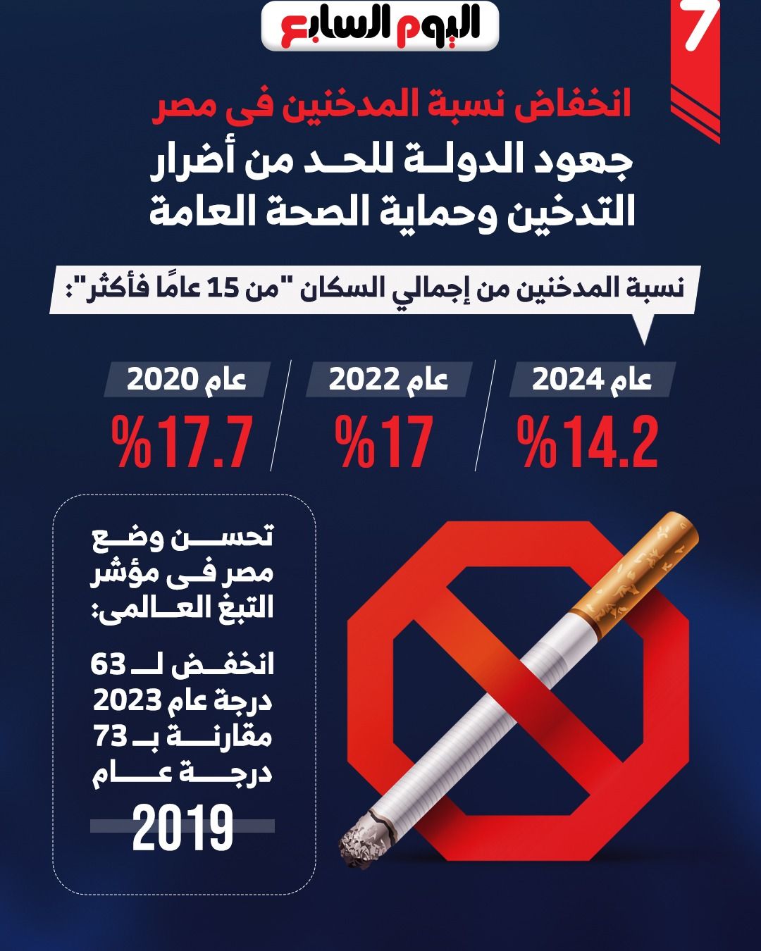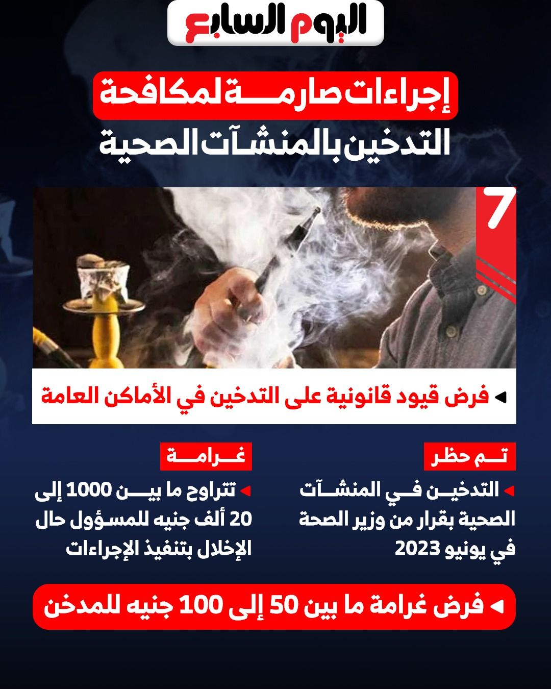 وفيما يتعلق بالإجراءات القانونية الصارمة التي تم اتخاذها لمكافحة التبغ في مصر، تم فرض قيود قانونية على التدخين في الأماكن العامة، بعدما تم إصدار قرار من وزير الصحة في يونيو 2023، بحظر التدخين في المنشآت الصحية، مع فرض غرامة تتراوح ما بين 1000 إلى 20 ألف جنيه للمسؤول حال الإخلال بتنفيذ الإجراءات، وكذلك غرامة ما بين 50 إلى 100 جنيه للمدخن.