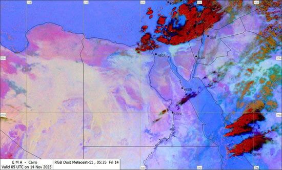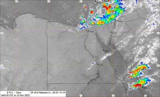الجمعة، 14 نوفمبر 2025 08:15 صأصدرت هيئة الأرصاد الجوية تحذيراً عاجلاً للمواطنين في مناطق السواحل الشمالية الشرقية وشمال الوجه البحري، وذلك في ضوء استمرار تدفق السحب الرعدية الممطرة وذلك في أحدث صور الأقمار الصناعية الصباحية.