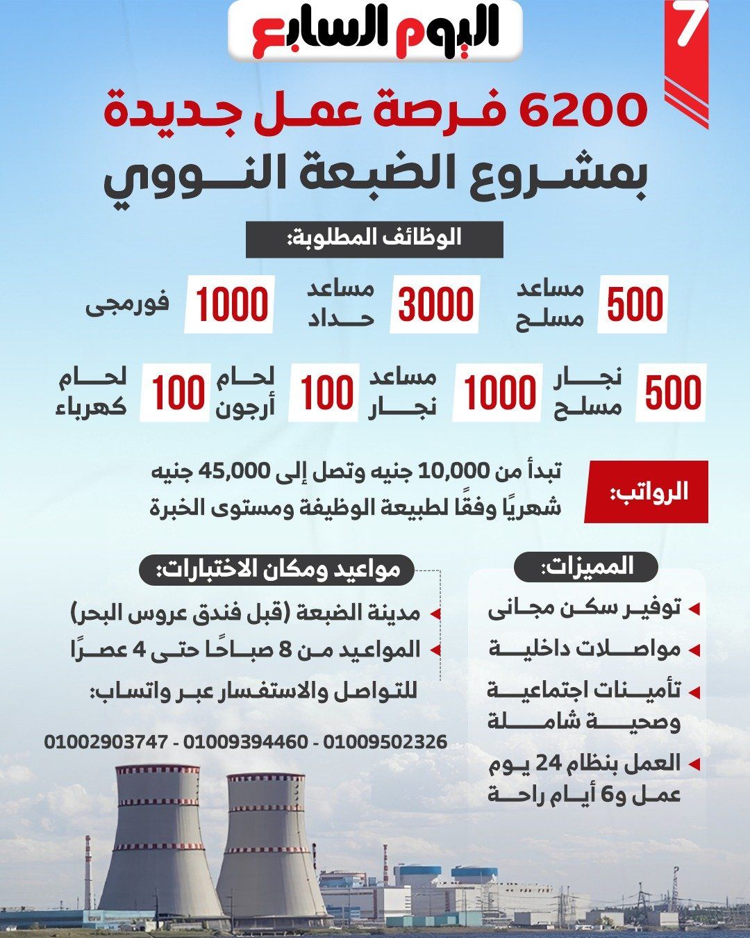 6200 فرصة عمل في مشروع الضبعة النووي بمرتبات تصل لـ45 ألف جنيه.. إنفوجراف