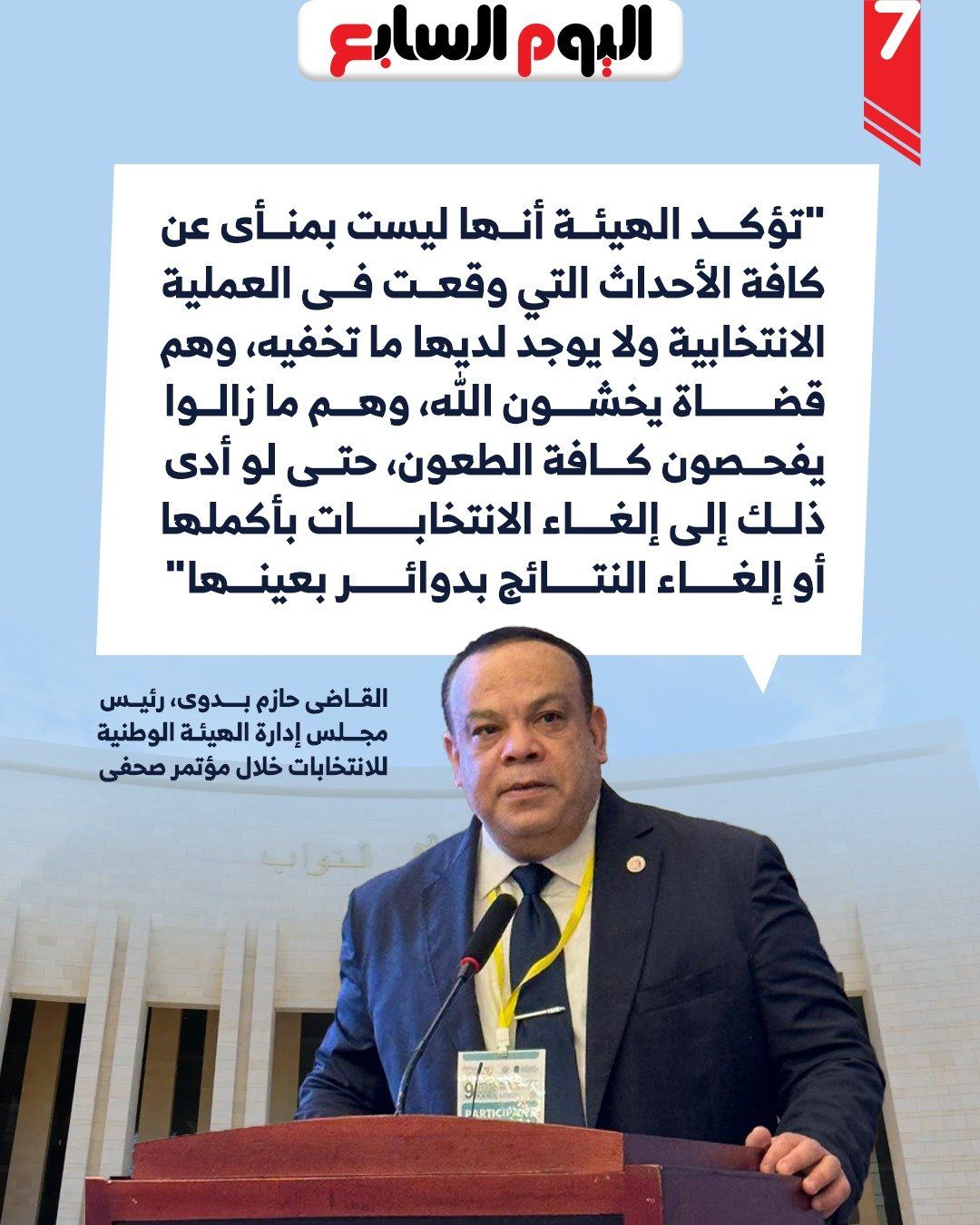 وينشر اليوم السابع، نص كلمة القاضى حازم بدوى رئيس الهيئة الوطنية للانتخابات فى المؤتمر كاملة..