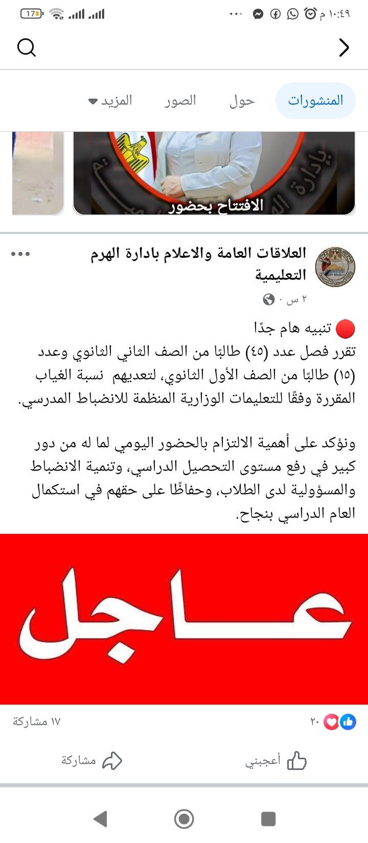 كما شددت إدارة الهرم التعليمية على ضرورة تسجيل الحضور والغياب يوميًا بدقة، واتخاذ الإجراءات القانونية حيال الغياب المتكرر، تنفيذًا للتعليمات الصادرة من وزارة التربية والتعليم بشأن تعزيز الانضباط داخل المدارس.