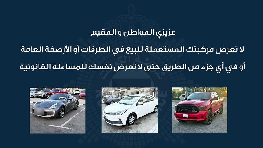 أصدرت الإدارة العامة للمرور تنبيهًا مروريًا دعت فيه المواطنين والمقيمين إلى تجنّب عرض مركباتهم المستعملة للبيع في الطرقات أو على الأرصفة العامة أو في أي جزء من الطريق، وذلك تفاديًا للمساءلة القانونية.