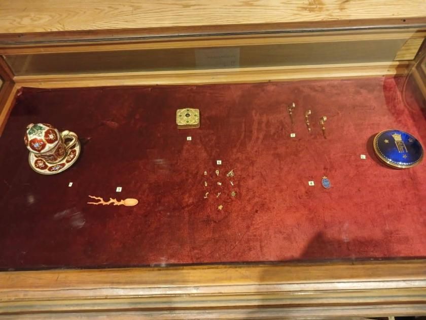 وأشار إلى أن المعرض يضم دبوس صدر مُزيَّناً بالمينا الزرقاء بداخله صورة لمحمد علي الكبير يعلوه التاج الملكي، إلى جانب عشر قطع من الدلايات الذهبية بأحجام وأشكال متنوعة، تمثل عربات وسيوف ملكية، فضلاً عن علبة من الفضة مُرصعة بفصوص من الزجاج الملون، وثلاث قطع «بايب» صغيرة مُزينة بالذهب.