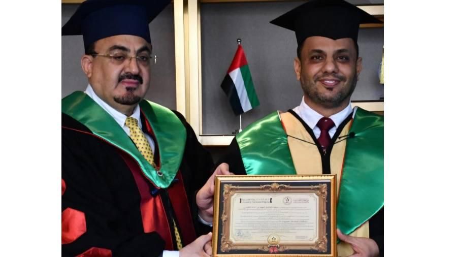 جاء ذلك في كلمة ألقاها الدكتورالمهندس خالد النابلسي ضمن حفل منحه شهادة الدكتوراه الفخرية في مجال الإبداع والابتكار المؤسسي من الجامعة الأفروآسيوية وذلك بحضور الفنان التشكيلي الشيخ علي بن عبد الله المعلا، ود.أحمد صبحي نائب رئيس الجامعة، ولفيف من أعضاء الاتحاد.
