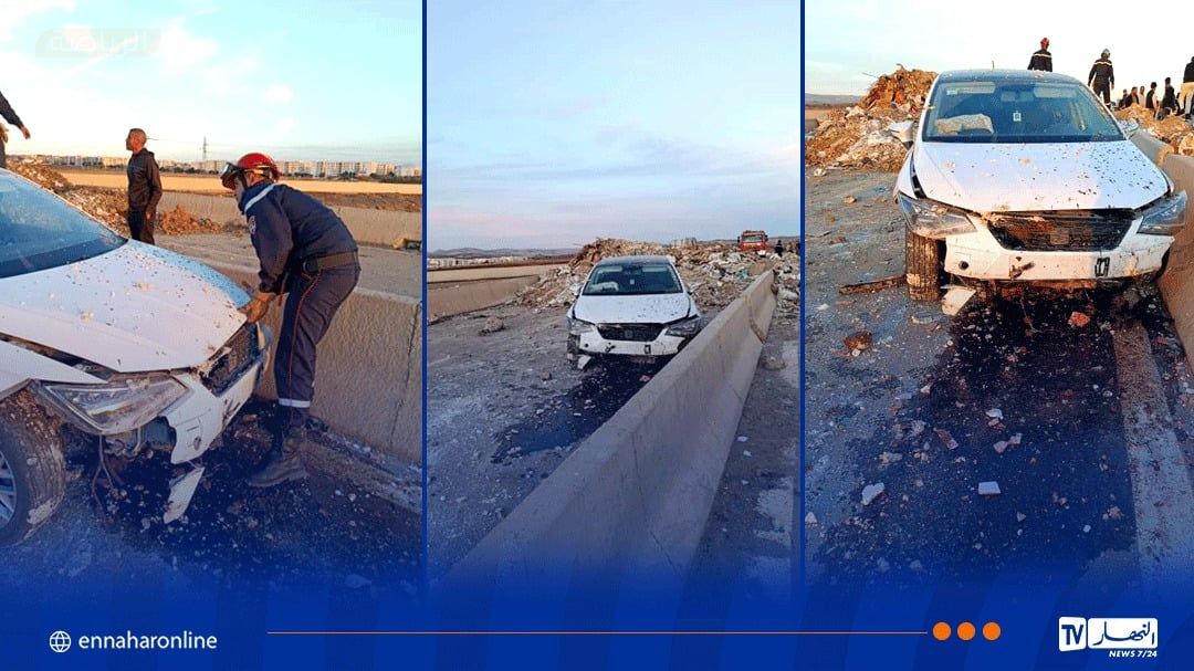 وتدخلت مصالح الحماية المدنية في حدود الساعة 17:31 لأجل حادث انحراف سيارة واصطدامها بحاجز من الركام .