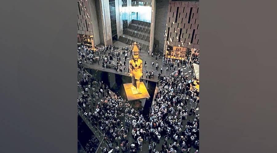 أعداد غفيرة تشاهد تمثال رمسيس الثاني، داخل المتحف المصري الكبير، الذي رفعت إدارته لافتة «كامل العدد» أمام الزوار، أمس، بعد وصول السعة التشغيلية للمتحف إلى الدرجة القصوى