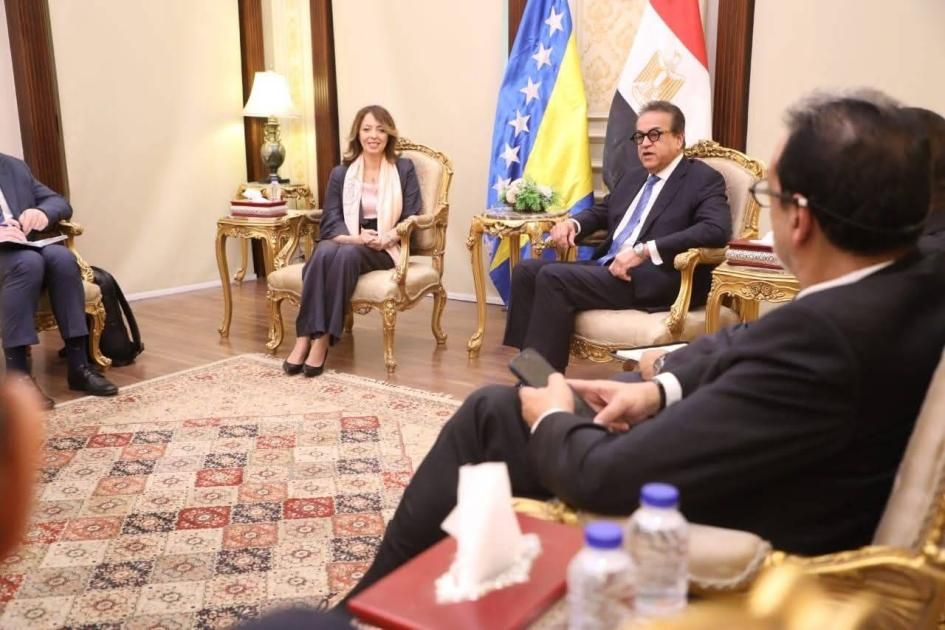 وقال د. حسام عبد الغفار، المتحدث الرسمي للوزارة إن د. خالد عبد الغفار، استقبل د. دوبافاكا بوسنجاك، وزيرة الشؤون المدنية في البوسنة والهرسك، حيث تم بحث سبل التعاون بين الجانبين في عدد من الملفات الصحية، كما وجه إليها الدعوة لحضور المؤتمر العالمي للسكان والصحة والتنمية البشرية، المقرر عقده الأربعاء، ويستمر حتى السبت، وذلك للتعرف عن قرب إلى التجربة المصرية في تطوير القطاع الصحي، ومناقشة القضايا العالمية المتعلقة بالصحة والسكان والتنمية البشرية، وتبادل الخبرات والرؤى بين الدول المشاركة.