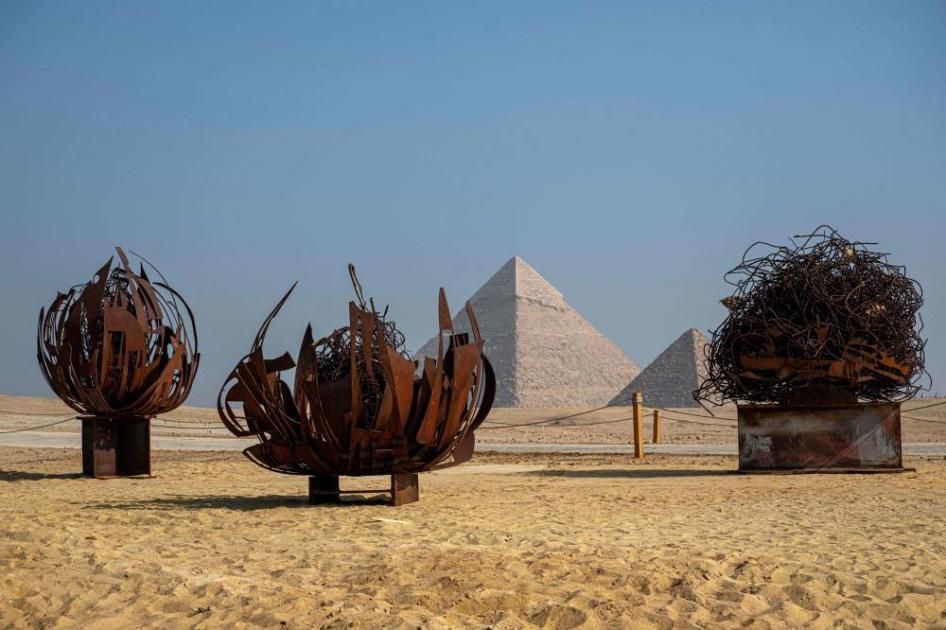 عُرِضَت نسخة ضخمة من عمل فني تجهيزي للفنان الإيطالي ميكيلانجيلو بيستوليتو، الثلاثاء، أمام أهرامات الجيزة في مصر، ضمن فعاليات مهرجان «فوريفر إز ناو» للفن المعاصر.