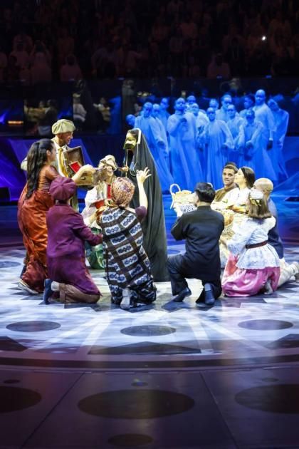 ومع بداية كل لوحة فنية، تعالت تعبيرات الإعجاب والدهشة، وكانت العيون تتنقل بلهفة بين أداء الفنانين الحي على المسرح وبين اللوحات المجسمة المعروضة فوق الرؤوس وتحملها قبة ساحل الوصل المبهرة.