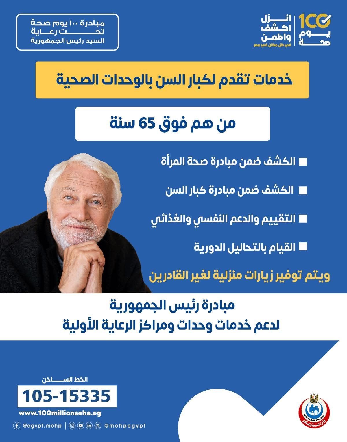 الأربعاء، 01 أكتوبر 2025 10:57 صكشفت وزارة الصحة والسكان عن حزمة من الخدمات الصحية التى تقدم لـ كبار السن بالوحدات الصحية والتى تتضمن.