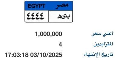 الخميس، 02 أكتوبر 2025 11:33 صأعلنت بوابة مرور مصر الإلكترونية، الان عن مزايدة على لوحة سيارة مميزة، سعرها وصل مليون جنيه، تحمل نمر ( ب ى هـ - 11) ومتزايد عليها حتى الان 4 اشخاص.