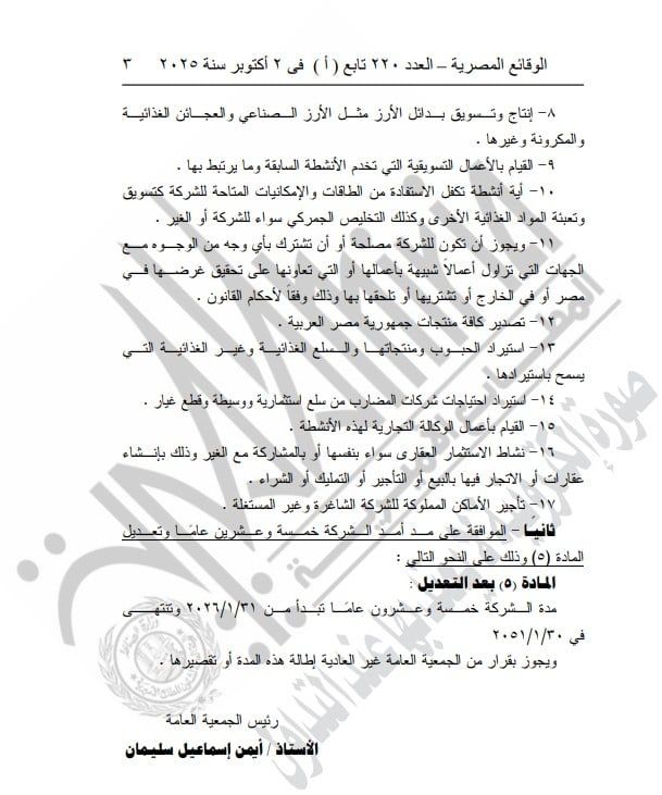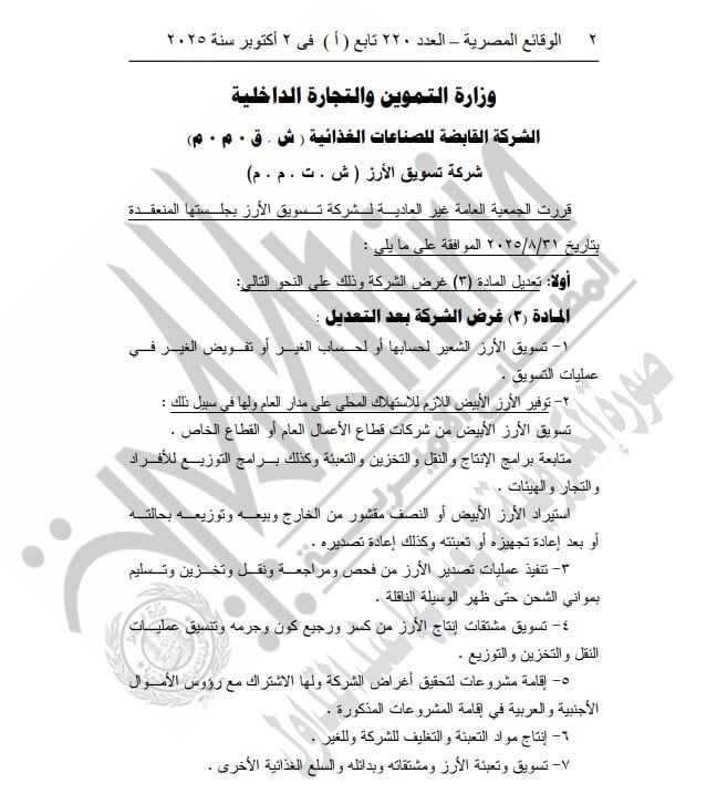 نشرت وزارة والتجارة الداخلية ممثلة في الشركة القابضة للصناعات الغذائية قرارا في الجريدة الرسمية تضمن  تعديل غرض شركة تسويق الأرز التابعة  للاتي .