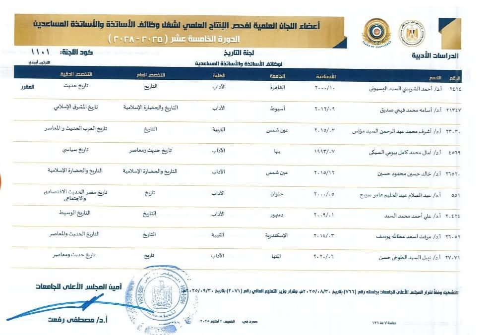 وتضمنت التشكيلات الجديدة أسماءً تظهر لأول مرة سواء على مستوى المقررين أو أعضاء اللجان العلمية، إلى جانب استمرار عدد من الأعضاء القدامى في بعض التخصصات والقطاعات الجامعية.
