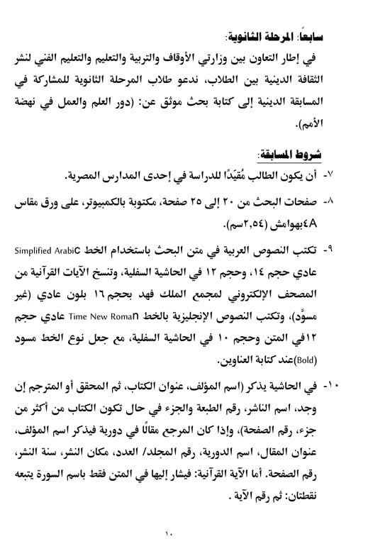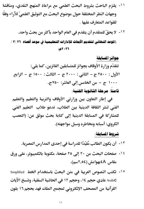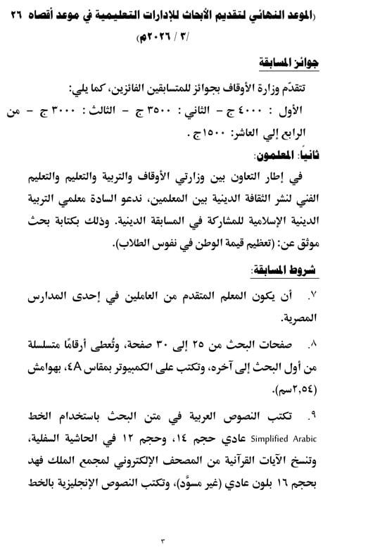 أعلنت وزارة الأوقاف، بالتعاون مع وزارة التربية والتعليم والتعليم الفني، عن انطلاق المسابقة الثقافية البحثية الكبرى في عامها السابع للعام الدراسي 2026/2025م، وذلك في إطار الشراكة المثمرة بين الوزارتين، وحرصهما على ترسيخ القيم الدينية والوطنية في نفوس الطلاب والمجتمع التعليمي.