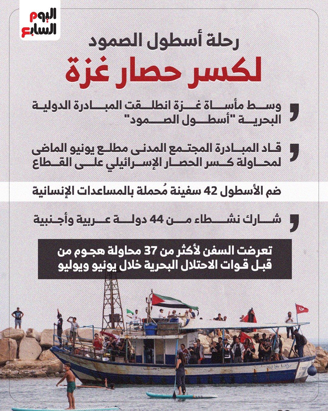 وضم الأسطول 42 سفينة محمّلة بالمساعدات الإنسانية والطبية، بمشاركة نشطاء من 44 دولة عربية وأجنبية، في خطوة رمزية تعبّر عن تضامن شعوب العالم مع سكان غزة.