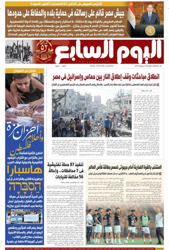 الرئيس السيسى فى الذكرى 52 لانتصارات أكتوبر المجيدة: جيش مصر قائم على رسالته فى حماية بلده والحفاظ على حدودها.. السلام المفروض بالقوة لا يولد إلا احتقانا.. لا استقرار راسخ بالمنطقة دون إقامة الدولة الفلسطينية.. ملحمة أكتوبر علمتنا أن النصر لا يمنح بل ينتزع.. «التنسيق بين مؤسسات الدولة وتماسك الجبهة الداخلية واليقين بنصر الله» هى مفاتيح النصر والمجد.. مصر وإسرائيل خاضتا حروبا ونزاعات عسكرية ضارية دفع فيها الطرفان أثمانا فادحة من الدم والدمار.. وكان للعداء أن يستمر ويتجذر لولا بصيرة الرئيس الساداتانطلاق مباحثات وقف إطلاق النار بين حماس وإسرائيل فى مصر.. خليل الحية يترأس الوفد الفلسطينى لمناقشة سبل إنجاز صفقة تبادل الأسرى.. والاحتلال يواصل التصعيد العسكرى ضد النازحين الفلسطينيين فى القطاع