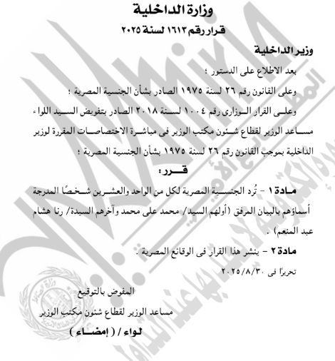 الثلاثاء، 07 أكتوبر 2025 09:51 صنشرت الجريدة الرسمية اليوم، قرار وزارة الداخلية برد الجنسية المصرية لـ21 شخصًا مرفق أسمائهم فى الكشوف التالية.