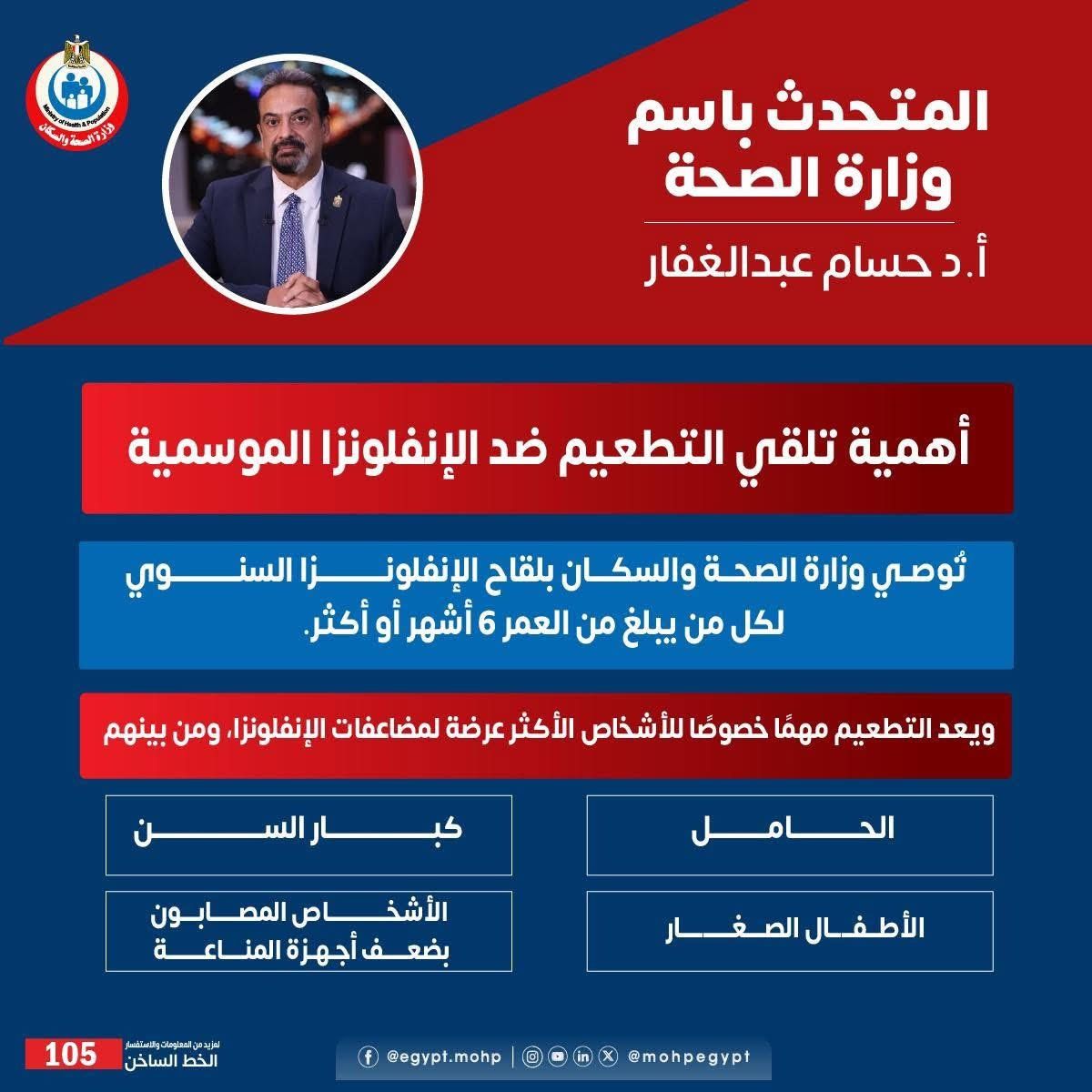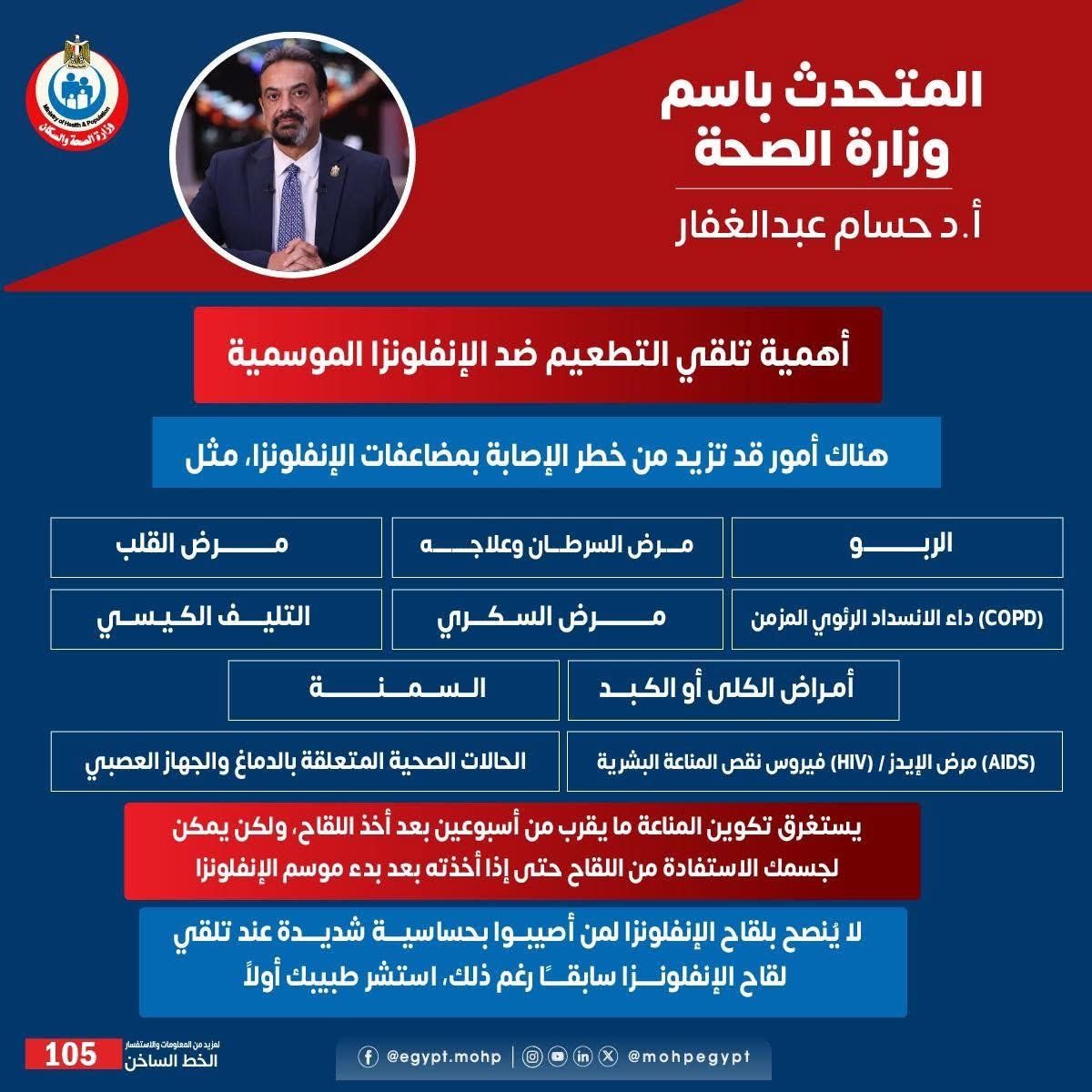 وتابع: غالبا لا نحتاج لتكرار الجرعة خلال الموسم الواحد رغبة في تحسين مناعة الشخص ضد الأنفلونزا إذا كان قد تلقي جرعاته بشكل سليم وقال الأشخاص الأكثر عرضة للاصابة هم الحوامل وكبار السن .