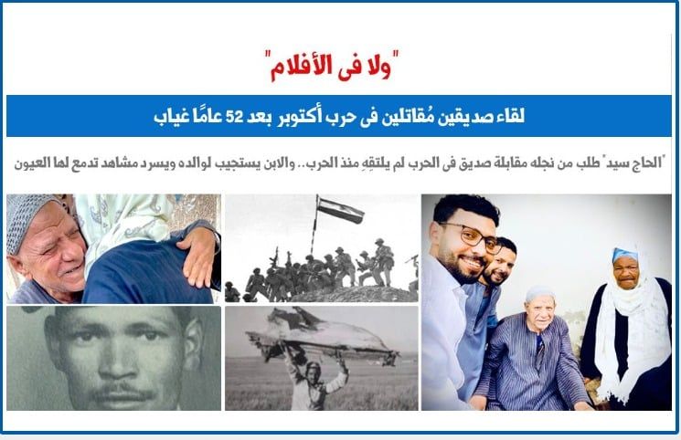 فى التقرير التالى، لن نتناول كالعادة أحداث ووقائع وذكريات الحرب المجيدة، كما هو معتاد فى مثل هذه المناسبات، ولكننا سنتحدث عن واقعة غريبة لا تتكرر كثيرًا فى حياتنا اليومية، حيث تذكر الحاج "سيد المبروك" صديق له فى حرب أكتوبر لم يلتقيا منذ إنتهاء الحرب – أى منذ 52 سنة – وهذه الواقعة لو أردنا أن نضع لها عنوانًا كبيرًا لكان "ولا فى الأفلام.. لقاء مقاتلين فى حرب أكتوبر بعد 50 عاما غياب".